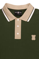 Le polo Sonora Olive est un polo à manches courtes à coupe moderne fabriqué en piqué de coton extensible dans les 4 sens. Ce polo décontracté pour homme offre style et confort, avec un col beige, des poignets rayés et un logo en caoutchouc représentant un ours.