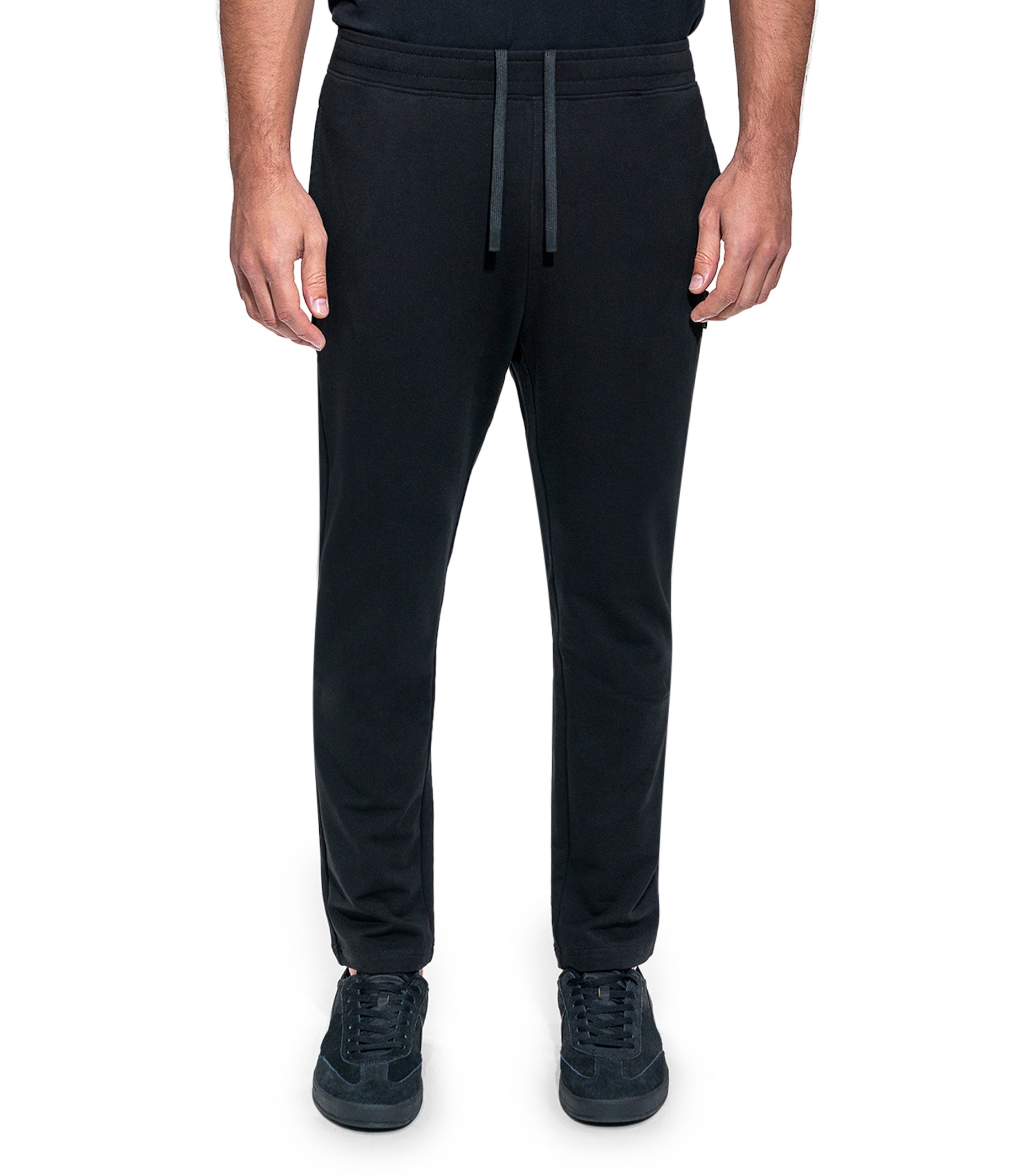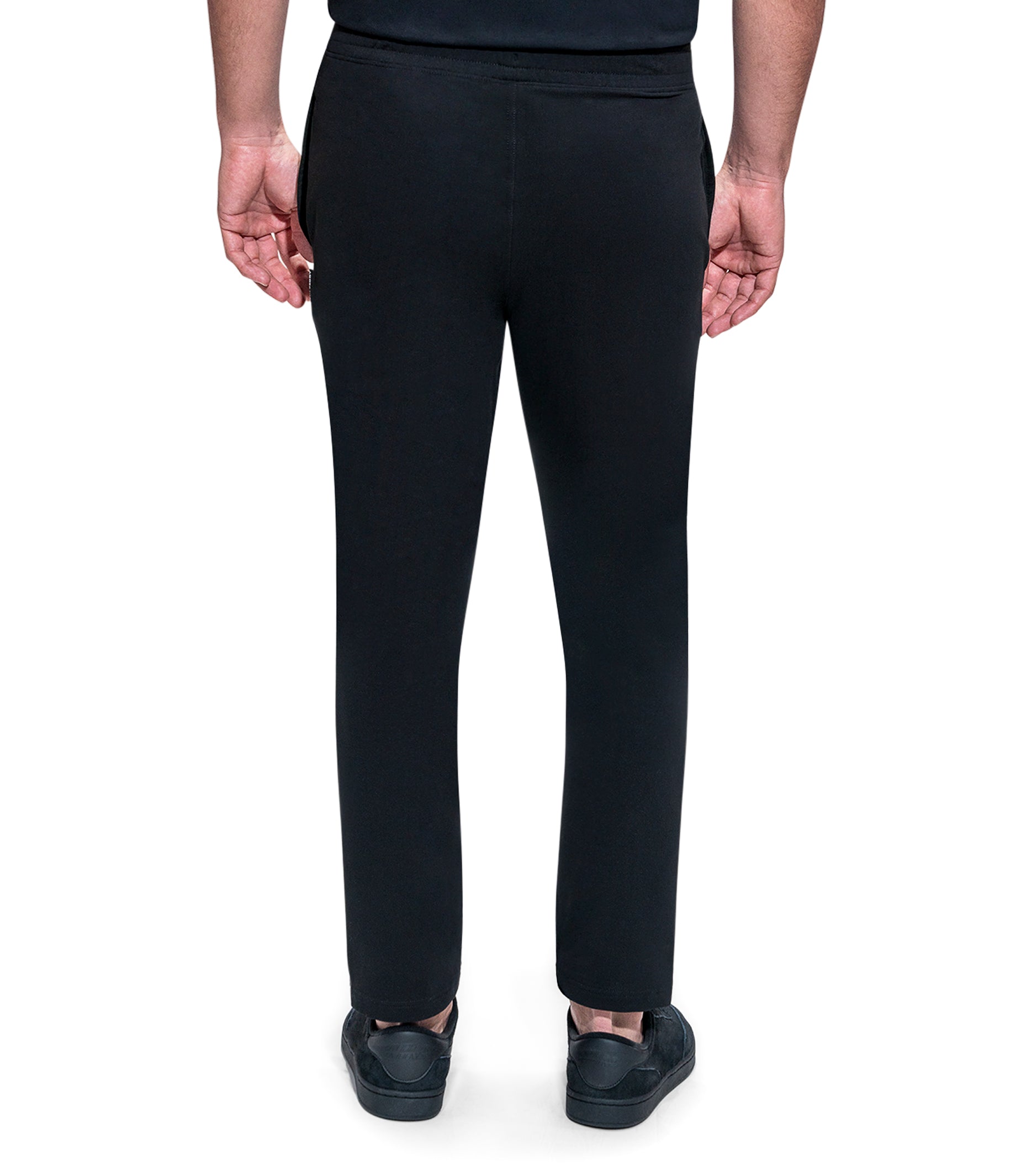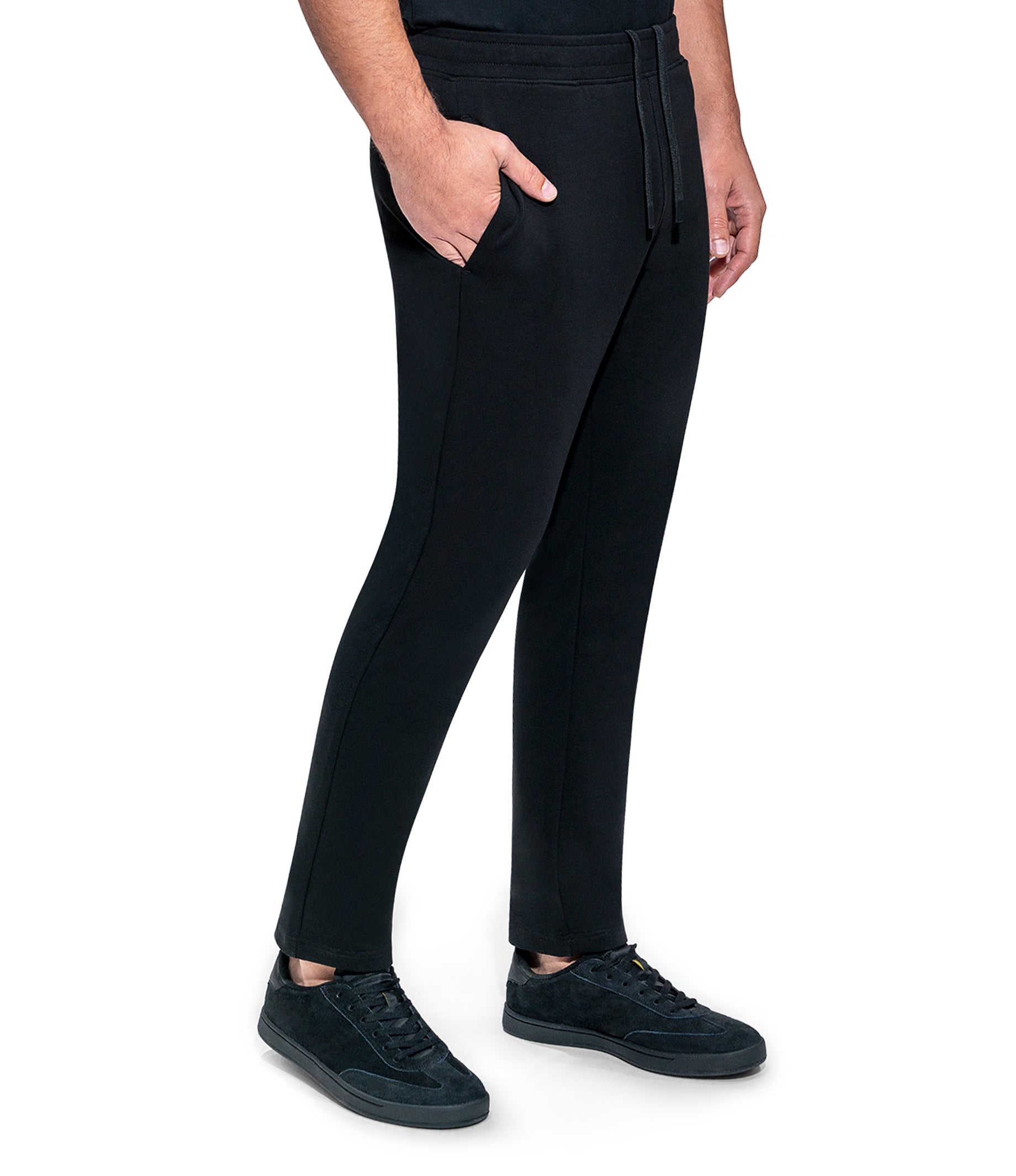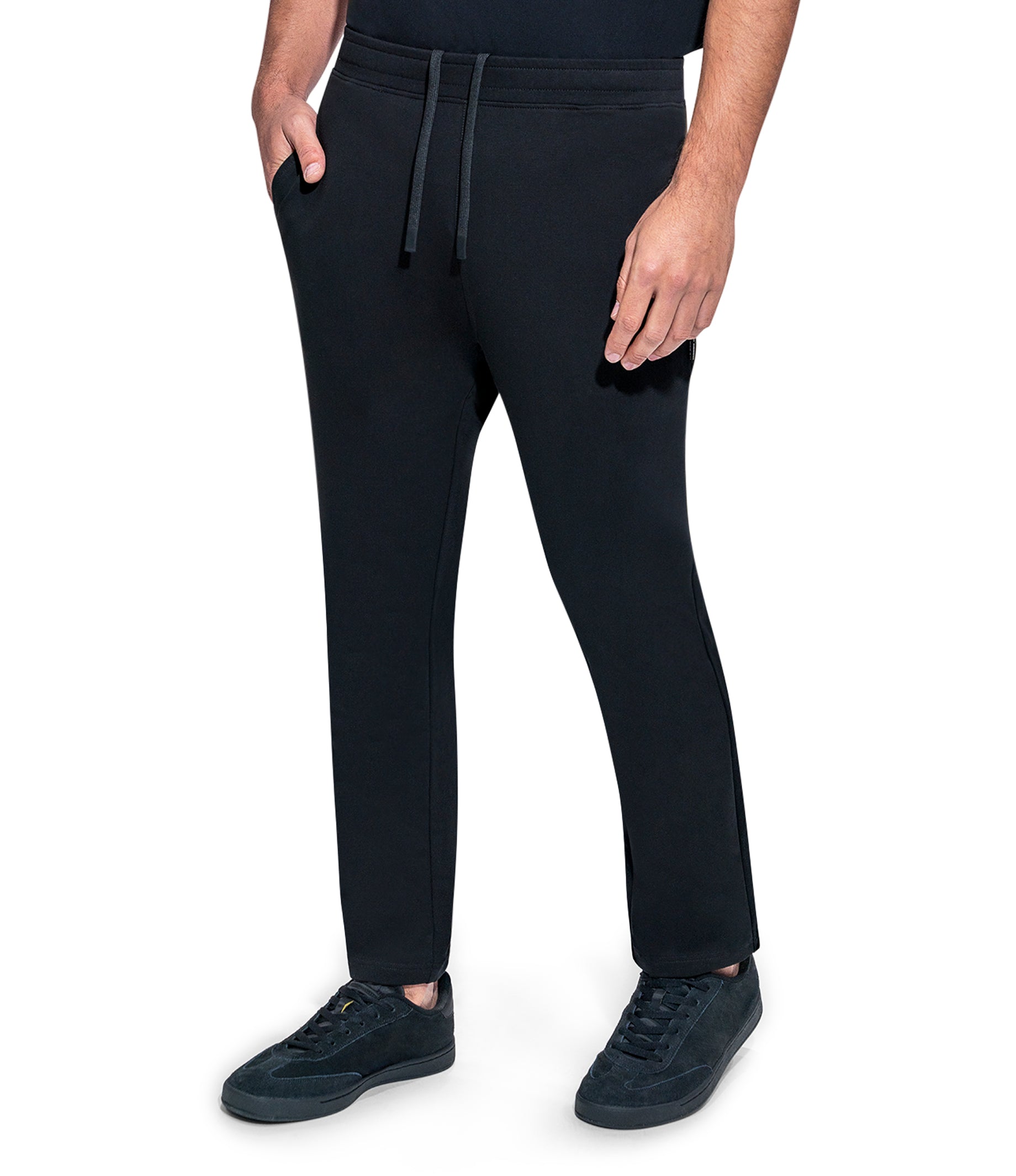 Drawstring Solid Jogger Straight Leg Woven Label Modern Fit 4 Way Stretch Elasticized Waistband Side Pockets Soft touch Machine Wash Inside Out Model is wearing a size M Color: BLACK Material: 96% Cotton 4% SpandexExpédition et retour
