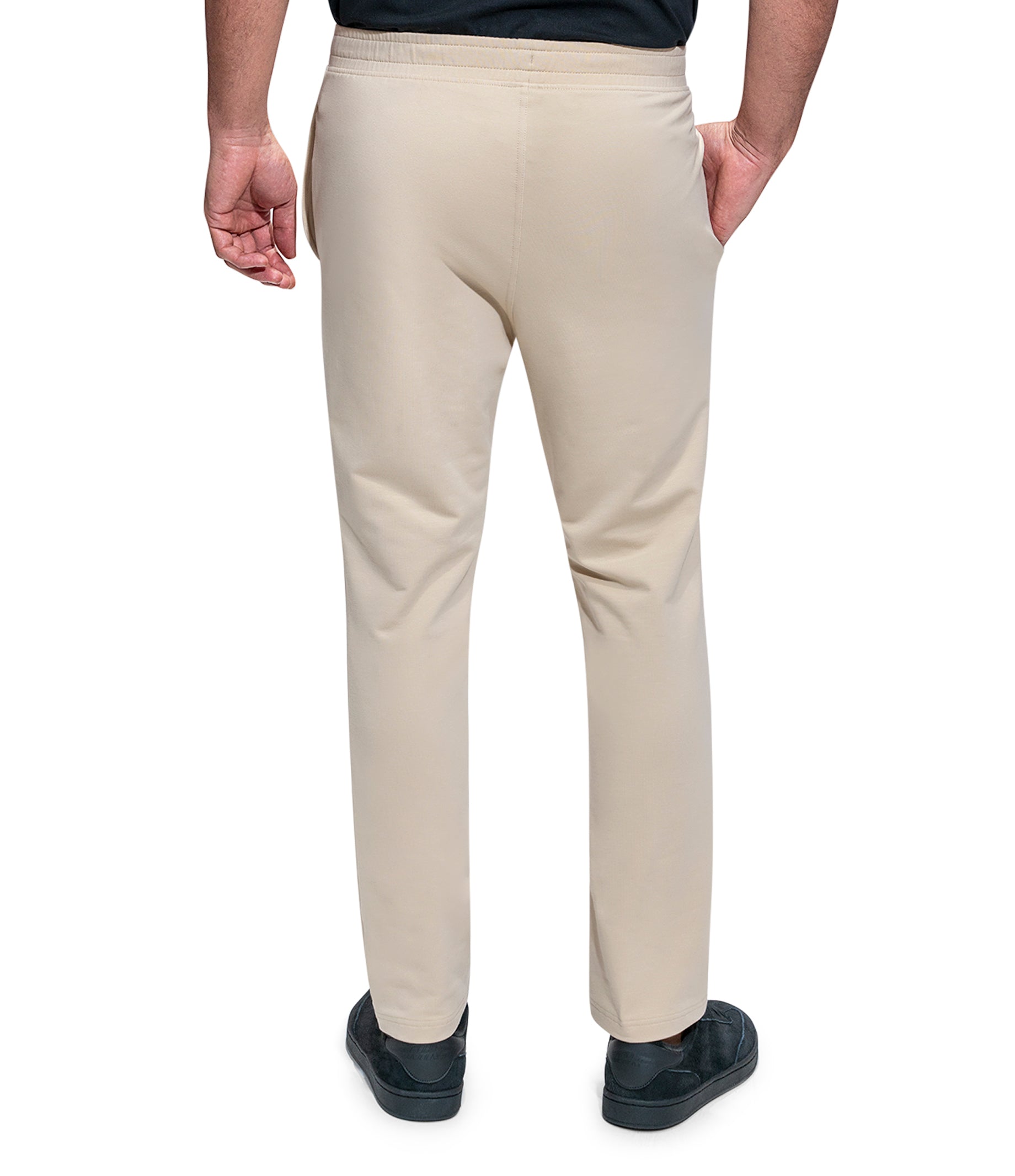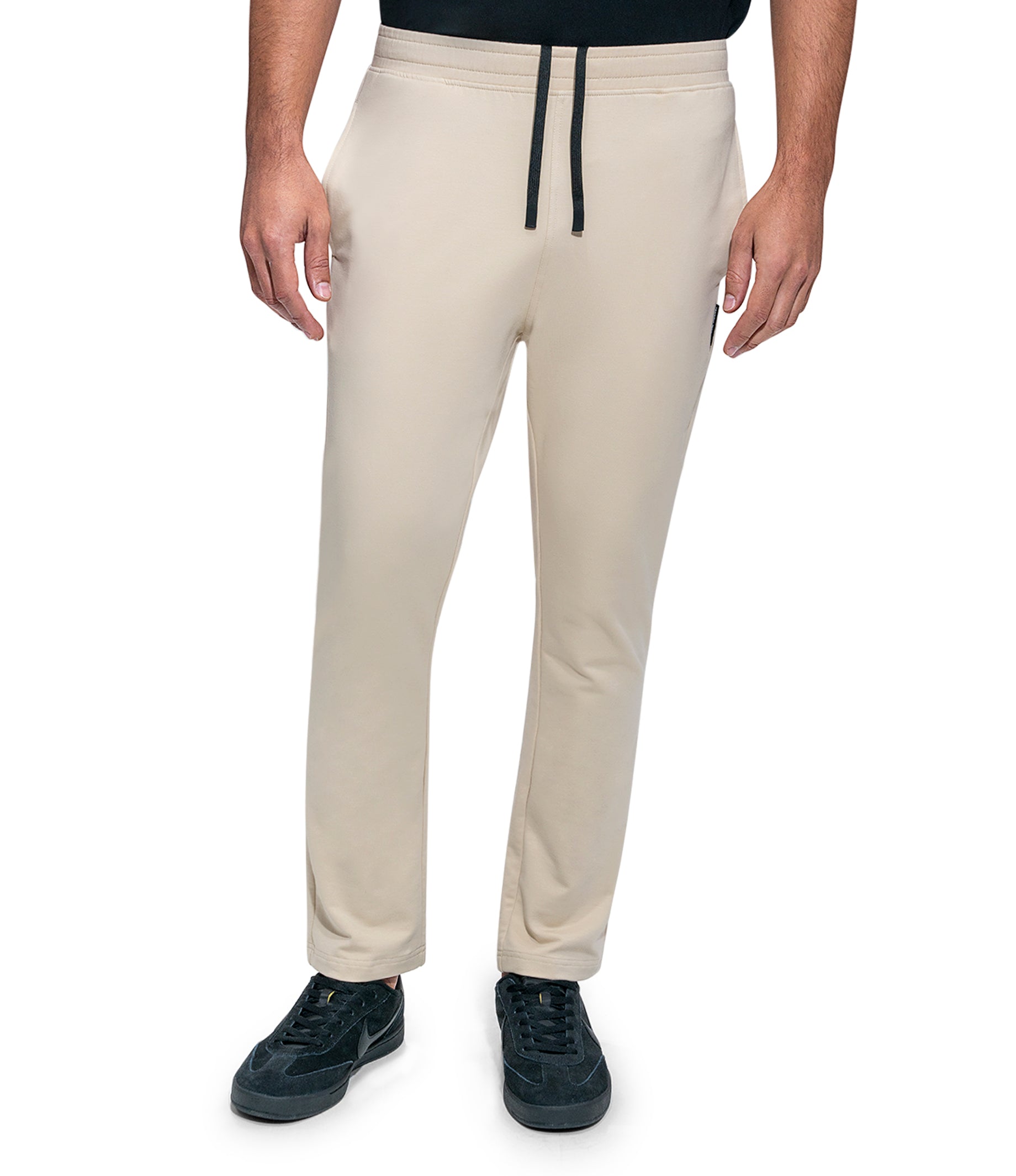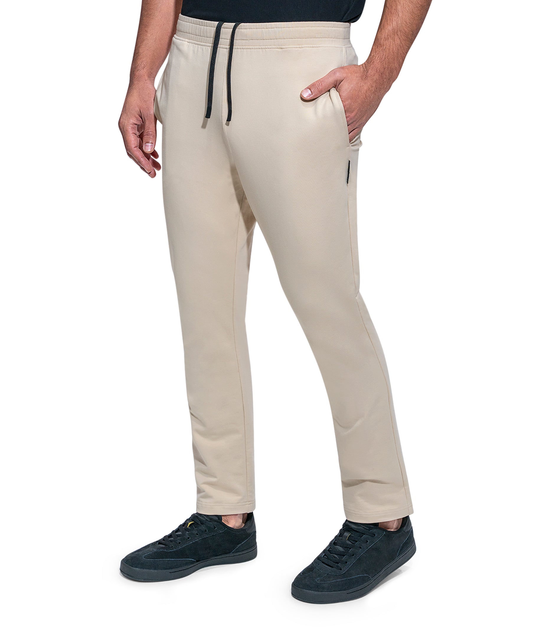 Drawstring Solid Jogger Straight Leg Woven Label Modern Fit 4 Way Stretch Elasticized Waistband Side Pockets Soft touch Machine Wash Inside Out Model is wearing a size M Color: SAND Material: 96% Cotton 4% SpandexExpédition et retour