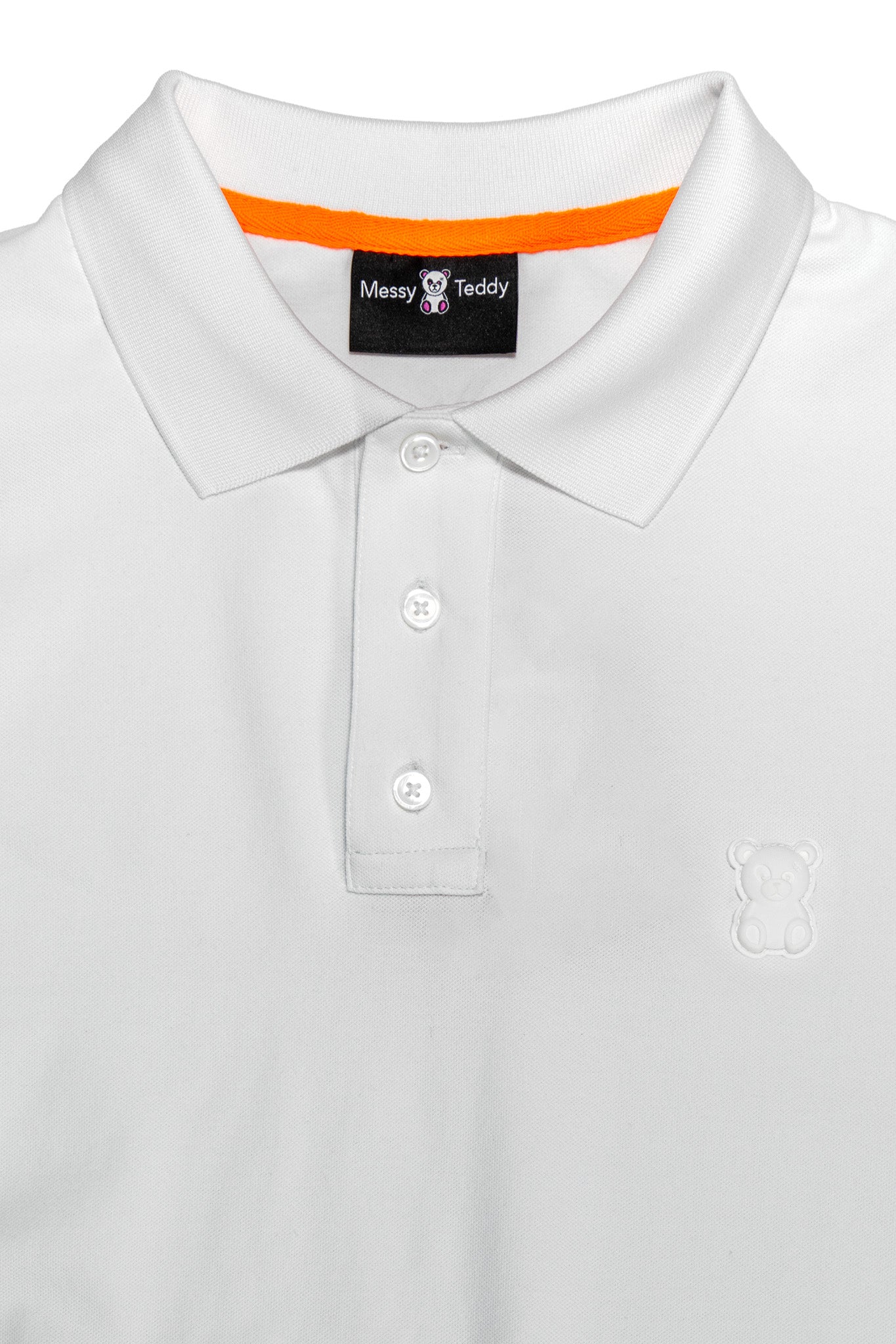 Piqué Polo Three-Button Closure Tape inside collar 4 Way Stretch Polo Collar Rubber Logo Mother of Pearl Button Eco-Friendly Soft Touch Breathable Durable Machine Wash Inside Out Model is and wearing a size M Color: WHITE Material: 95% Cotton 5% SpandexSHIPPING & RETURN