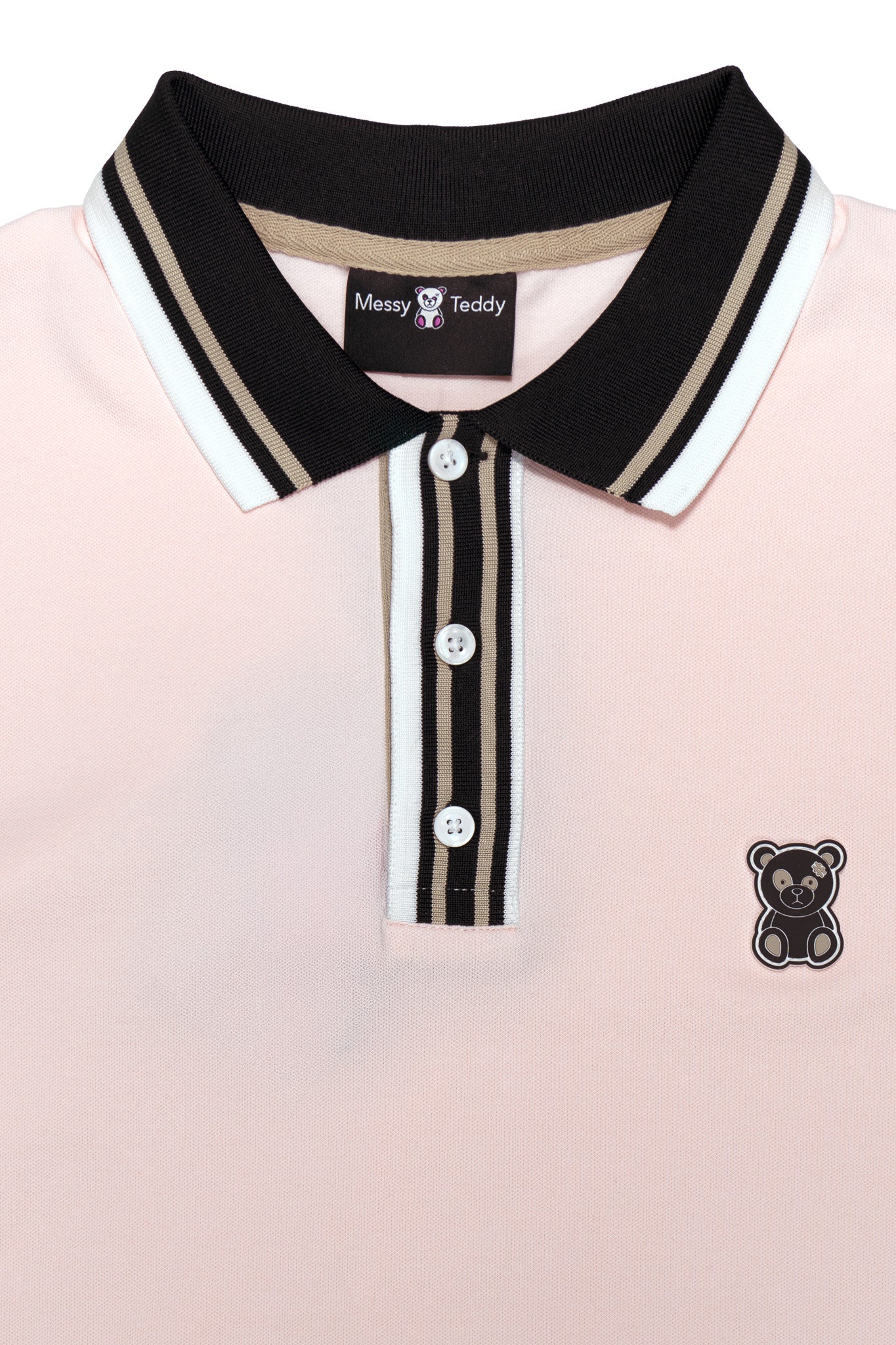 Piqué Polo Three-Button Closure Tape inside collar 4 Way Stretch Polo Collar Rubber Logo Mother of Pearl Button Eco-Friendly Soft Touch Breathable Durable Machine Wash Inside Out Model is and wearing a size M Color: PINK Material: 95% Cotton 5% SpandexSHIPPING & RETURN