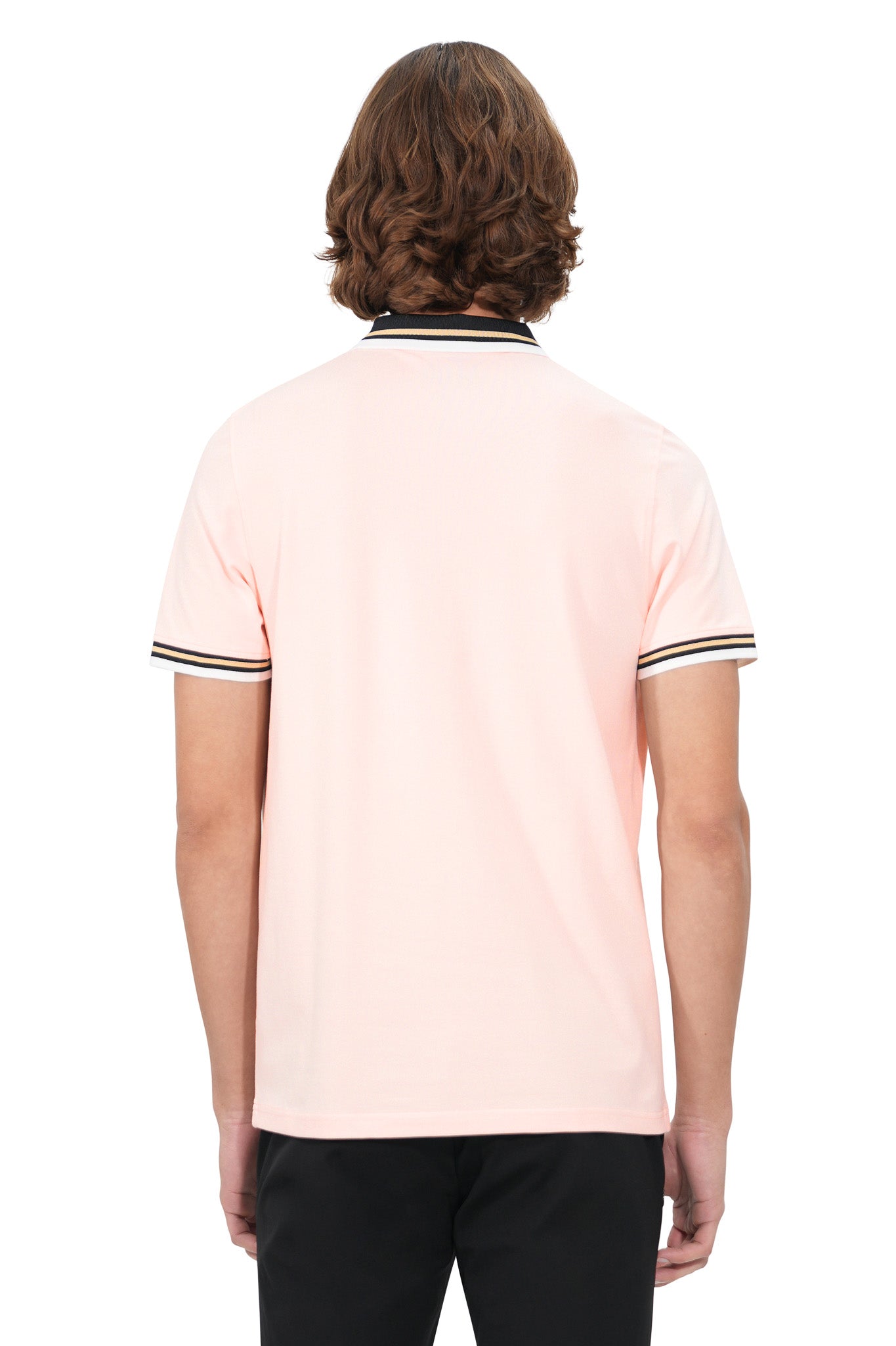 This solid PINK short-sleeve polo piqué, crafted from 95% cotton and 5% spandex, offers a soft, breathable feel with added stretch for comfort and flexibility. It features a three-button placket with two color and striped, a sophisticated rib collar with stripes and rib cuff with double stripe detailing, all complemented by mother of pearl buttons, seamlessly combining, function, and versatility, offering style and comfort for any occasion.