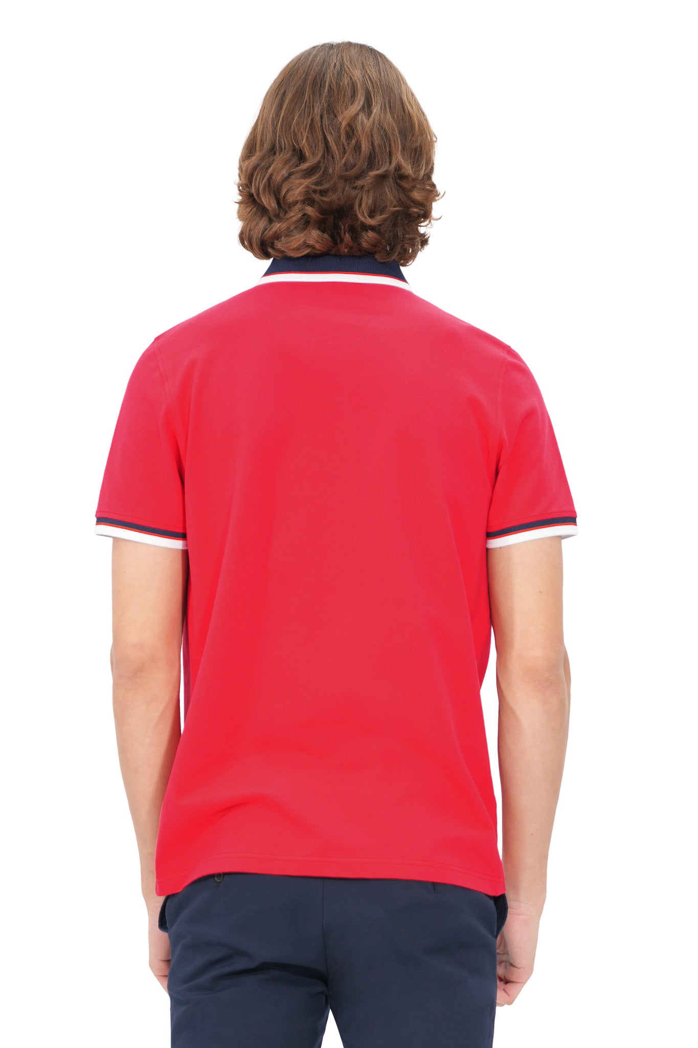 This solid RED short-sleeve polo piqué, crafted from 95% cotton and 5% spandex, offers a soft, breathable feel with added stretch for comfort and flexibility. It features a three-button placket, a sophisticated rib collar with stripes and rib cuff with double stripe detailing, all complemented by mother of pearl buttons, seamlessly combining, function, and versatility, offering style and comfort for any occasion.