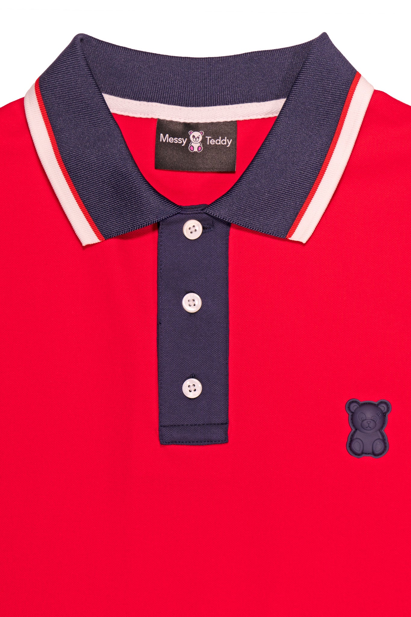 Piqué Polo Three-Button Closure Tape inside collar 4 Way Stretch Polo Collar Rubber Logo Mother of Pearl Button Eco-Friendly Soft Touch Breathable Durable Machine Wash Inside Out Model is and wearing a size M Color: RED Material: 95% Cotton 5% SpandexSHIPPING & RETURN