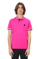 Piqué Polo Three-Button Closure Tape inside collar 4 Way Stretch Polo Collar Rubber Logo Mother of Pearl Button Eco-Friendly Soft Touch Breathable Durable Machine Wash Inside Out Model is and wearing a size M Color: FUCHSIA Material: 95% Cotton 5% SpandexSHIPPING & RETURN